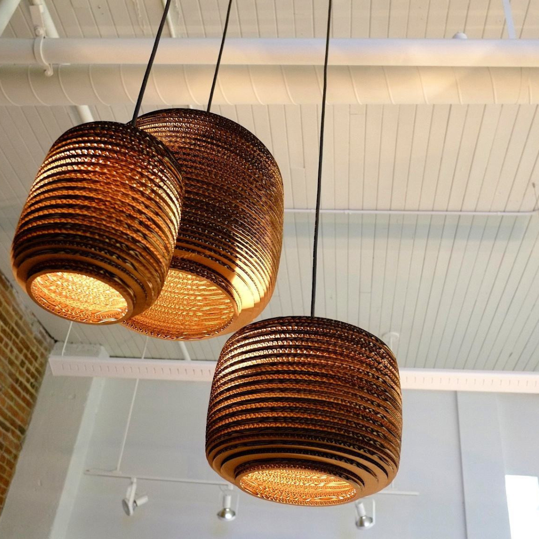 Scraplights are constructed from natural recycled cardboard precision cut by a laser. This gives the edges their classic dark appearance and enhances the warm light projected through the corrugation. Ausi is available in three colors and 3 sizes.