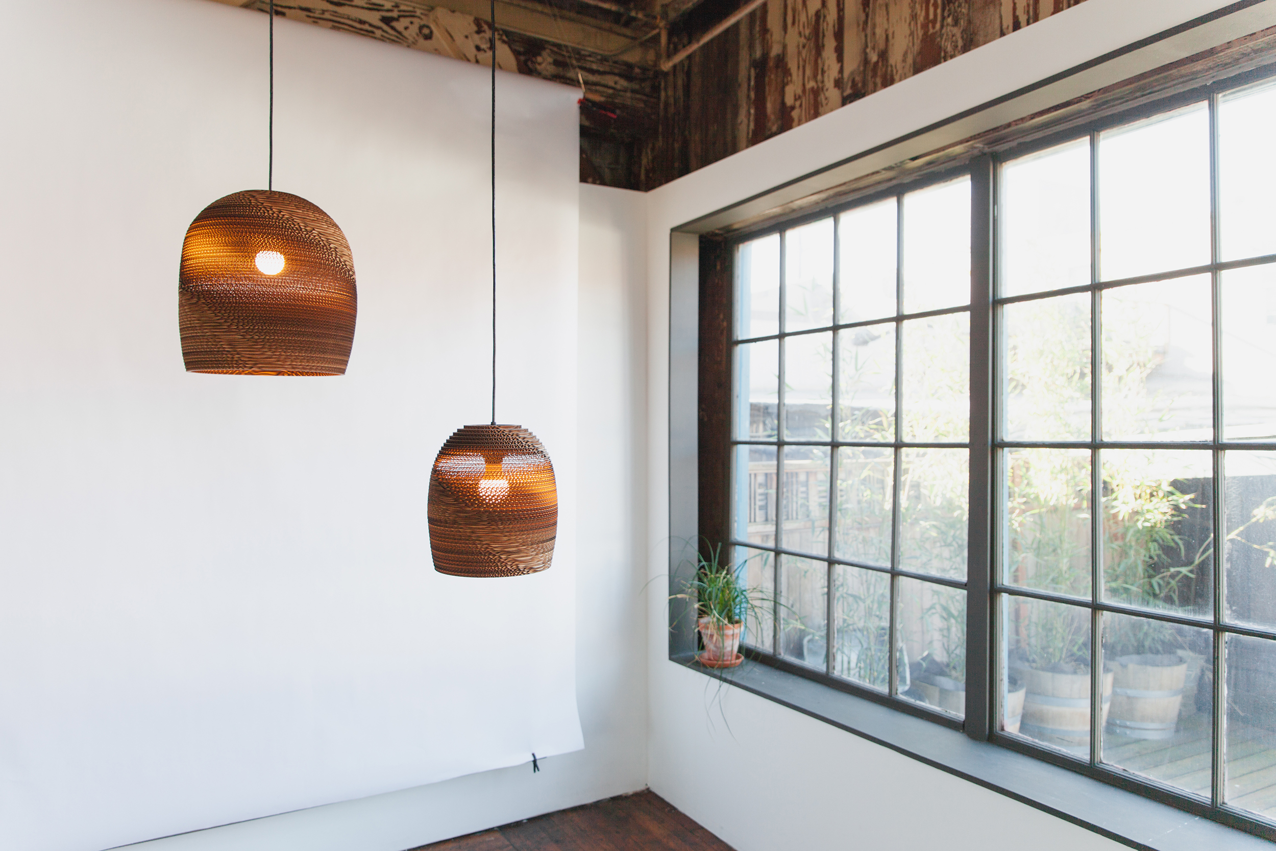 Handcrafted from 100% post-consumer recycled cardboard, our flagship Scraplights provide warm, intimate, and functional lighting for any occasion or space. Tough and elegant, each pendant is precision cut with a laser, giving the edges a slightly dark appearance and enhancing the warm light projected through the corrugation. Scraplights are assembled by hand using non-toxic adhesive and treated with a non-toxic fire retardant.
