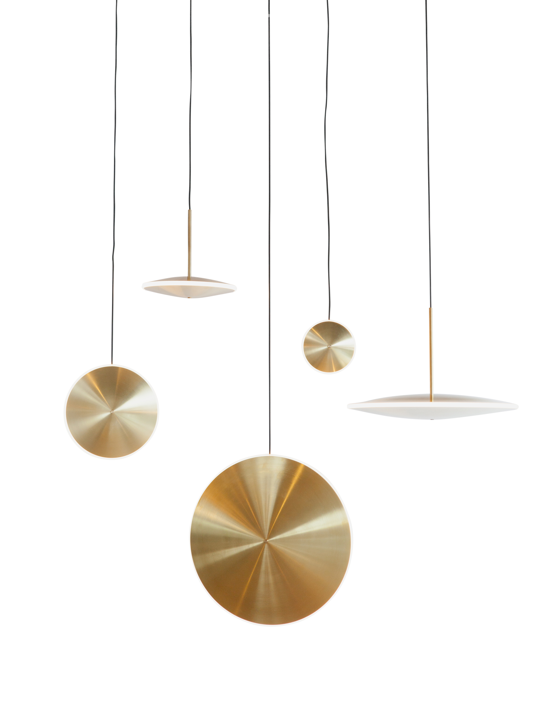 Mimicking the phosphorescent envelope found around stars, Chrona lights create a luminous glow by combining spun brass and diffused acrylic. With a variety of configurations in both horizontal and vertical orientations, Dish pendants can be clustered together to make stunning constellations or individually hung to accentuate any space. Thin, yet robust, the pendants are available in diameters ranging from 6 to 17 inches (14-42cm).