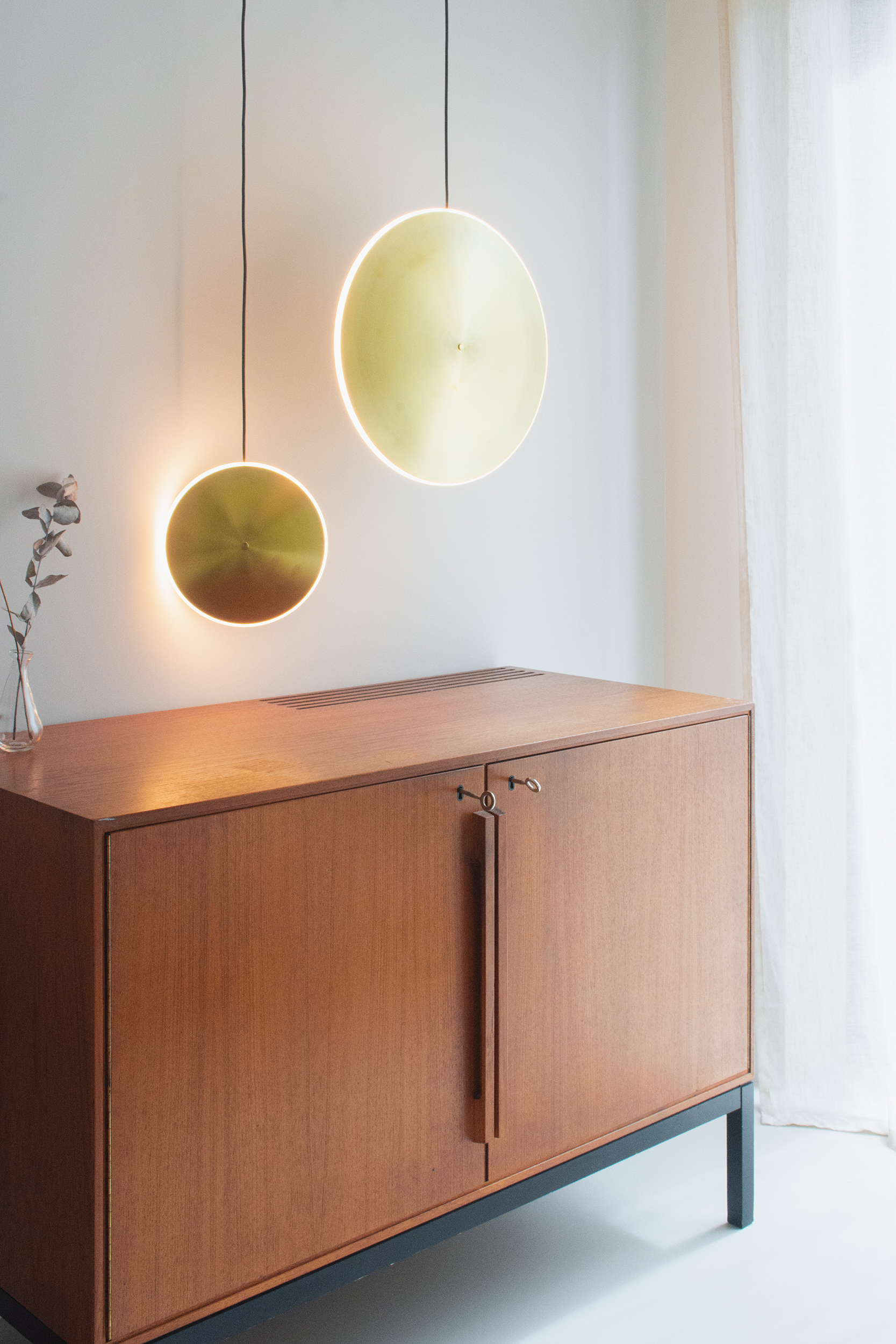 Mimicking the phosphorescent envelope found around stars, Chrona lights create a luminous glow by combining spun brass and diffused acrylic. With a variety of configurations in both horizontal and vertical orientations, Dish pendants can be clustered together to make stunning constellations or individually hung to accentuate any space. Thin, yet robust, the pendants are available in diameters ranging from 6 to 17 inches (14-42cm).