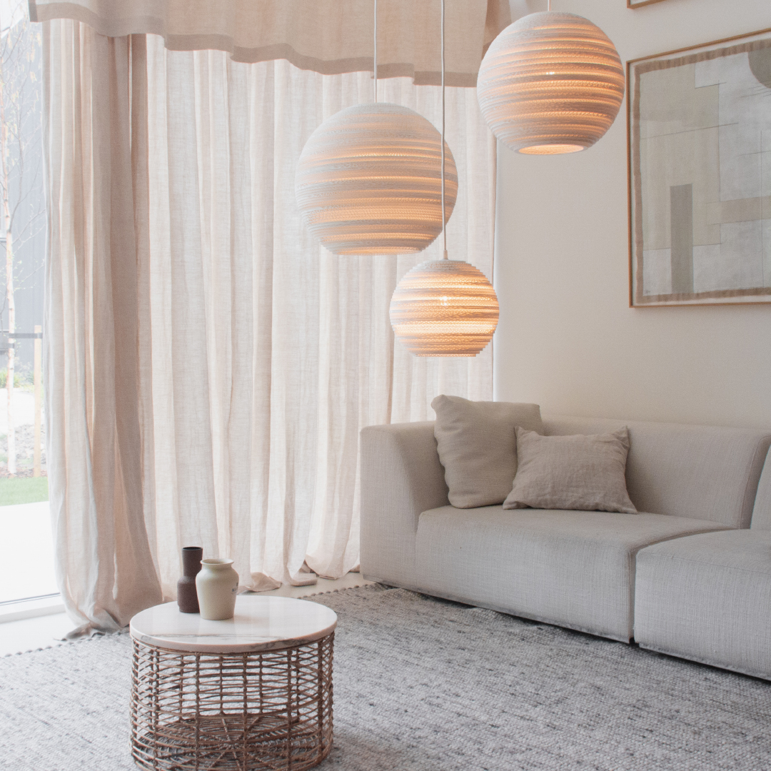 Scraplights are constructed from natural recycled cardboard precision cut by a laser. This gives the edges their classic dark appearance and enhances the warm light projected through the corrugation. The classic series includes many of the best-selling models such as the Moon and Disc, along with newer designs like the Hive and Nest.