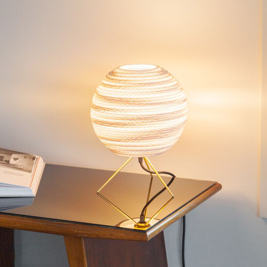 Each table lamp features a sturdy brass frame, black cord, and durable rocker switch. Handcrafted from recycled cardboard, Graypants’ flagship Scraplights provides warm, intimate, and functional lighting for any occasion or spac